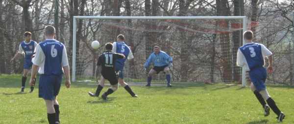 Die Erste hatte am Karfreitag das am 18.3. ausgefallene Spiel in Lucka nachzuholen. Bis zur Pause verlief die Partie sehr gemütlich. Die Gastgeber hatten dabei mehr Einschussmöglichkeiten. Sie verfehlten jedoch das Tor oder scheiterten am sehr guten Dennis, wie hier in der 7. Minute...