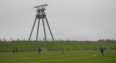 Die Erste hatte am siebenten Spieltag ein Auswärtsspiel beim SV Löbichau. Der Förderturm im Hintergrund kündet von der Bergbaugeschichte des Ortes. Bei Hochnebel war es zu Spielbeginn kühl, feucht und dunkel. |