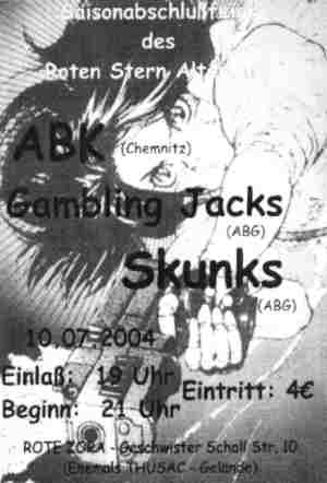 Am Samstag den 10.07.04 stieg in der Roten Zora die Saisonfeier. Die Party begann 21 Uhr und es spielten die Bands Gambling Jacks, ABK und Skunks. Hier einige Bilder: